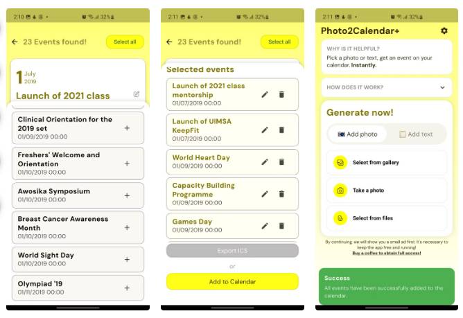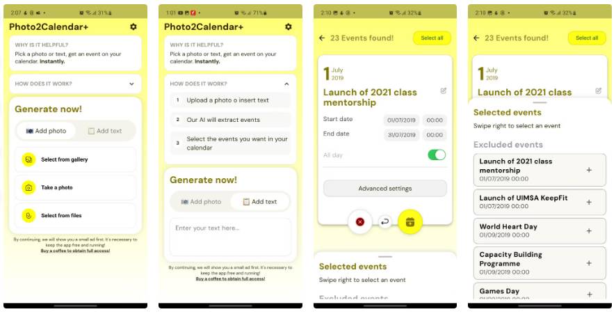 Photo2Calendar giải quyết vấn đề này bằng cách sử dụng AI để diễn giải cấu trúc của hình ảnh thay vì chỉ đơn giản là bóc tách văn bản. Giao diện của ứng dụng rất đơn giản và gọn gàng. Khi mở ứng dụng, bạn sẽ thấy một màn hình màu vàng sáng và 3 tùy chọn đơn giản: Chọn từ thư viện, chụp ảnh hoặc chọn từ file. Bạn cũng có thể thêm văn bản trực tiếp nếu đã sao chép chi tiết sự kiện từ tin nhắn hoặc email.
