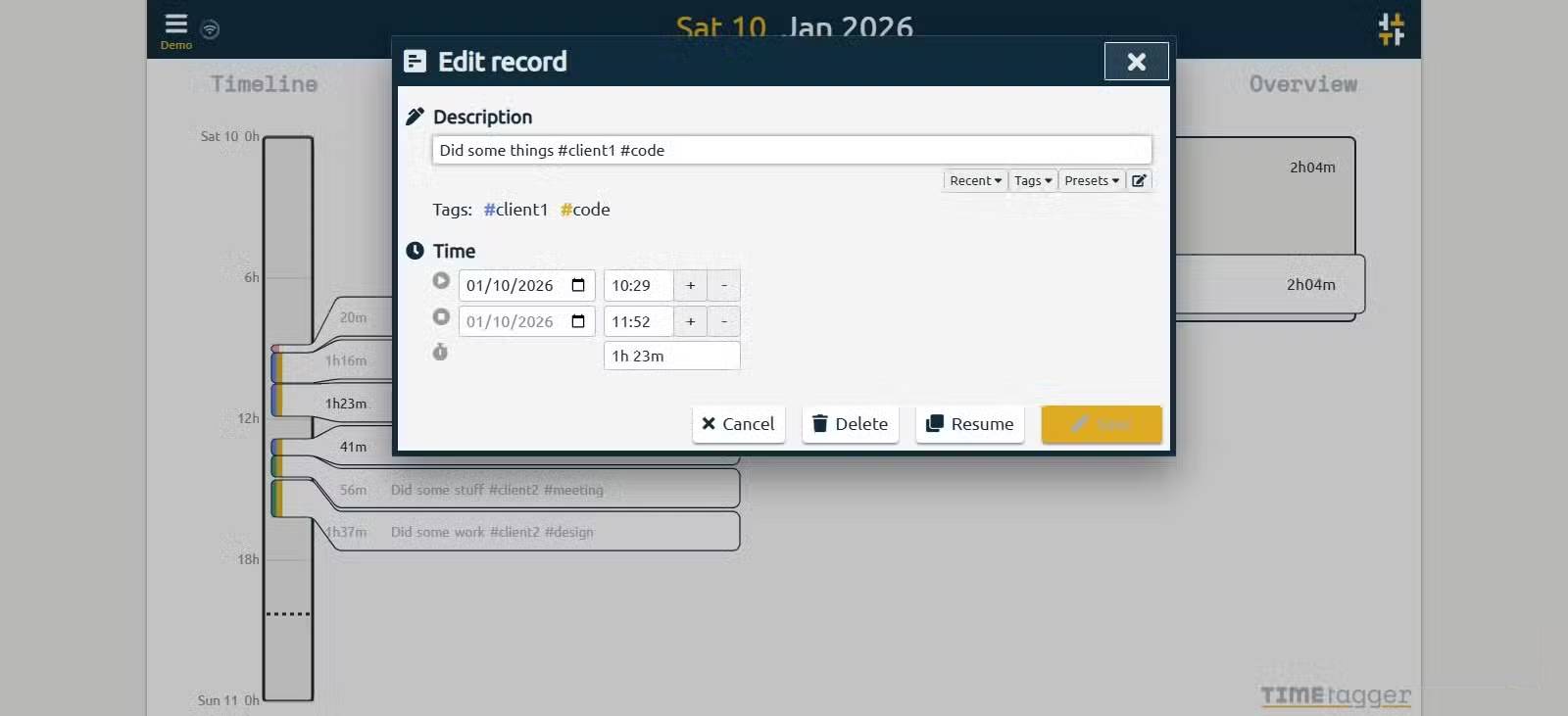 TimeTagger là một ứng dụng theo dõi thời gian dựa trên web, mã nguồn mở. Nó có giao diện timeline tương tác đơn giản và các công cụ báo cáo mạnh mẽ.