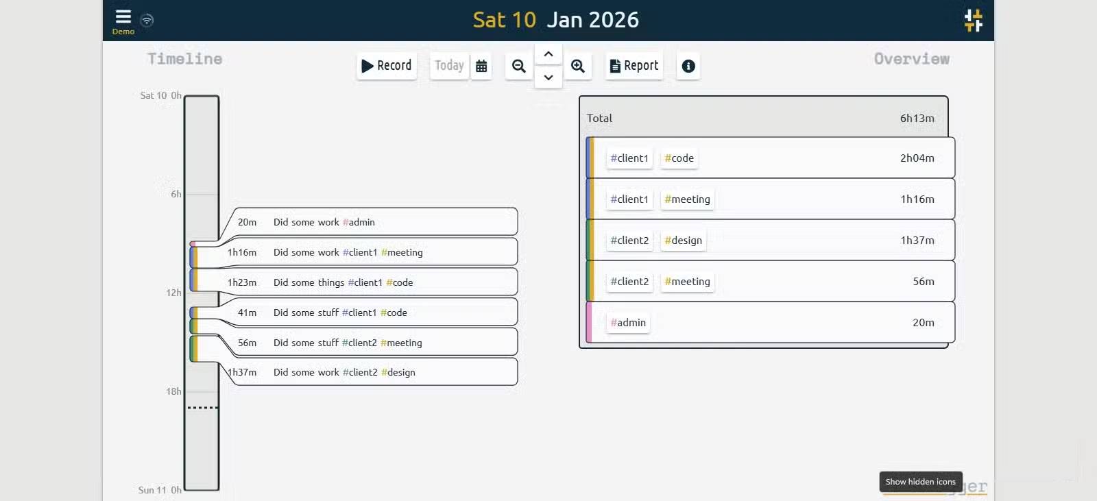 TimeTagger hiển thị toàn bộ ngày làm việc trên một timeline dọc. Nó giống như một tấm gương hơn là một công cụ theo dõi. Khi xem lại ngày của mình, bạn sẽ bắt đầu cảm thấy hơi khó chịu khi nhận ra có những khoảng trống không thể giải thích một cách hoàn hảo.
