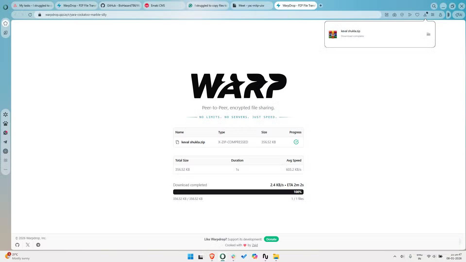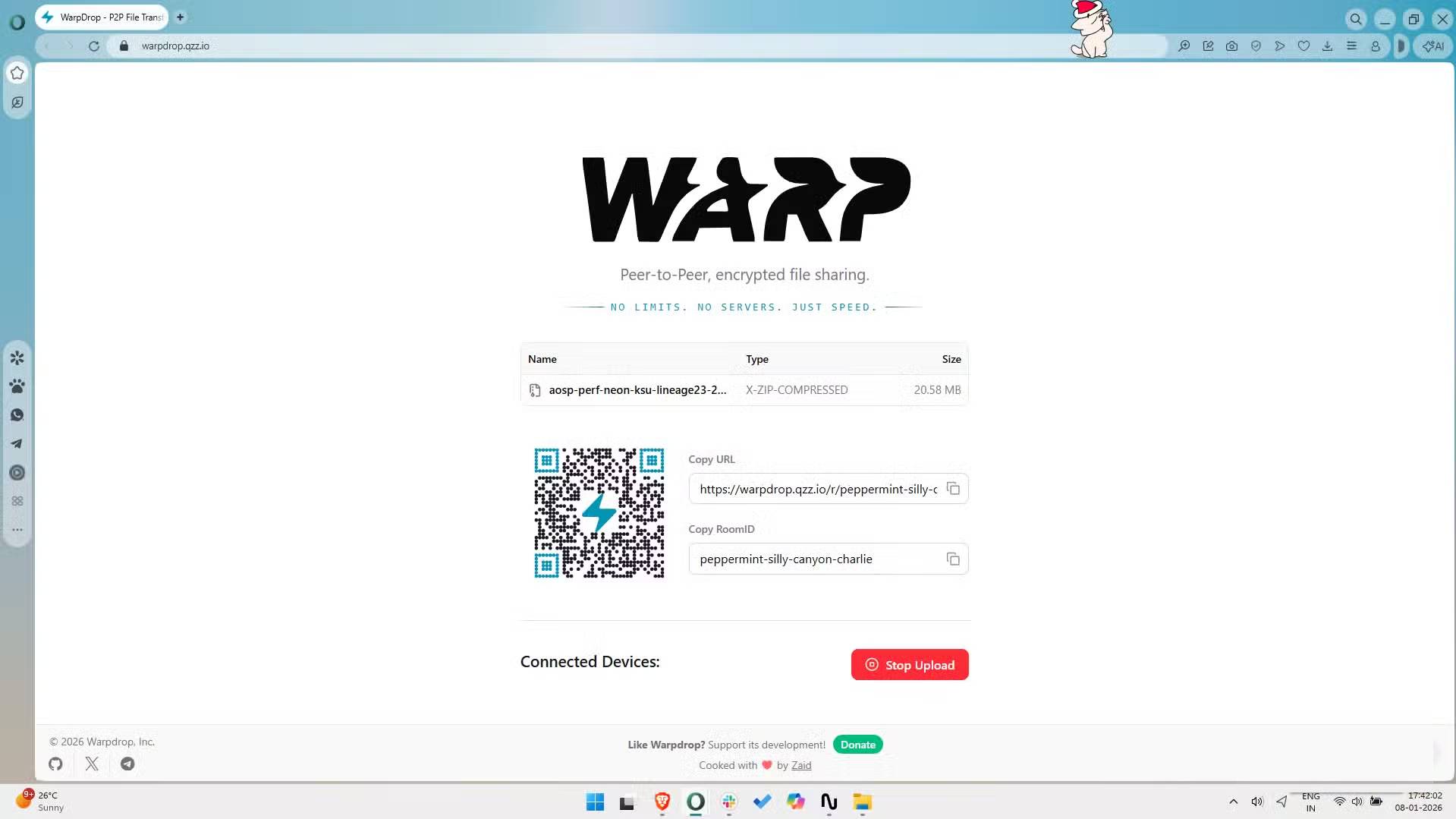 WarpDrop là một công cụ mã nguồn mở miễn phí, hoạt động gần như kỳ diệu. Bạn có thể gửi một file có kích thước bất kỳ từ terminal của máy tính mình và nhận nó trên trình duyệt của máy tính khác, tất cả mà không cần cài đặt thêm phần mềm. Chia sẻ file bằng WarpDrop rất dễ dàng; chỉ cần kéo thả file và chia sẻ liên kết.