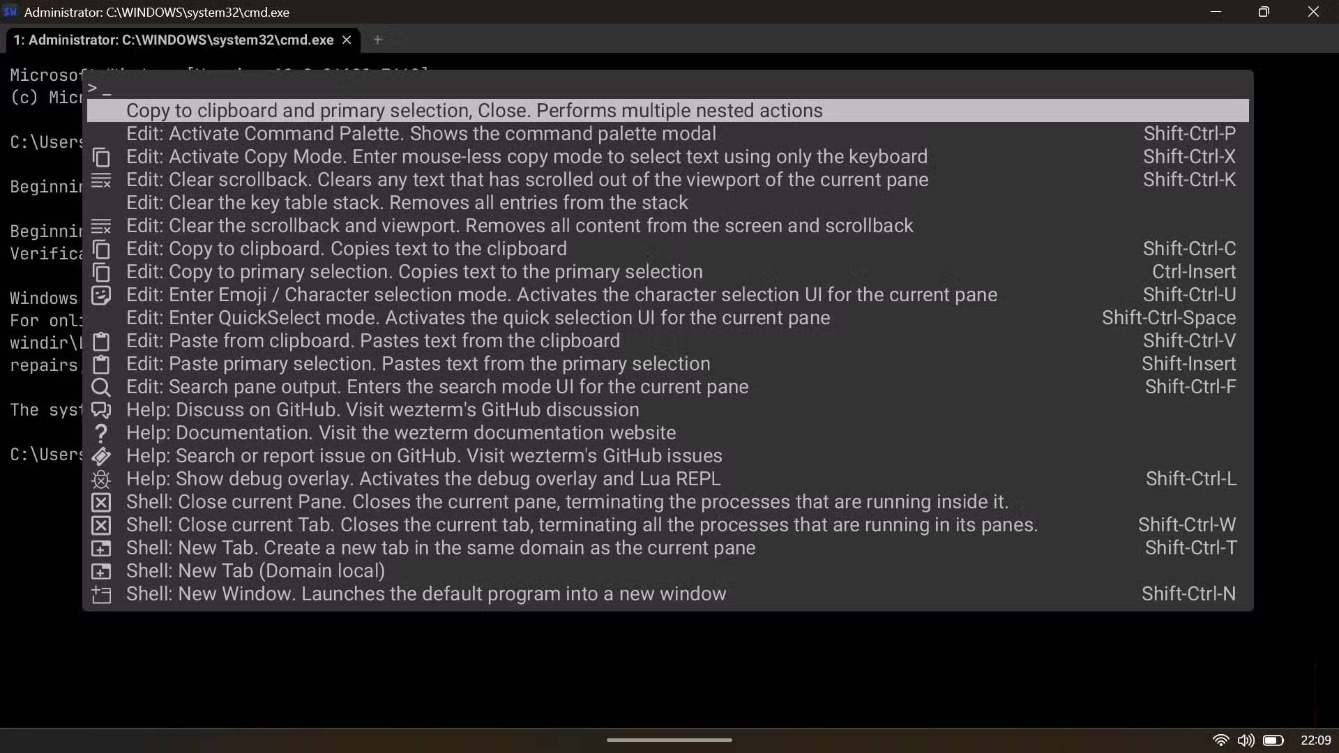 WezTerm cũng cung cấp tính năng đa nhiệm ngay trong terminal, vì vậy bạn không cần cài đặt và cấu hình Tmux hoặc screen. Bạn có thể tạo các khung cửa sổ, chuyển đổi giữa các tab và sắp xếp toàn bộ không gian làm việc bên trong giao diện gốc. Trình đa nhiệm tích hợp bao gồm tính năng cuộn ngược với tìm kiếm đầy đủ, hỗ trợ chuột với tính năng Quick Select và chế độ sao chép văn bản chuyên dụng. Palette lệnh tích hợp giúp việc điều hướng trở nên trực quan: nhấn Ctrl + Shift + P để tìm mọi hành động có sẵn, bạn có thể tìm kiếm và thực thi chúng.