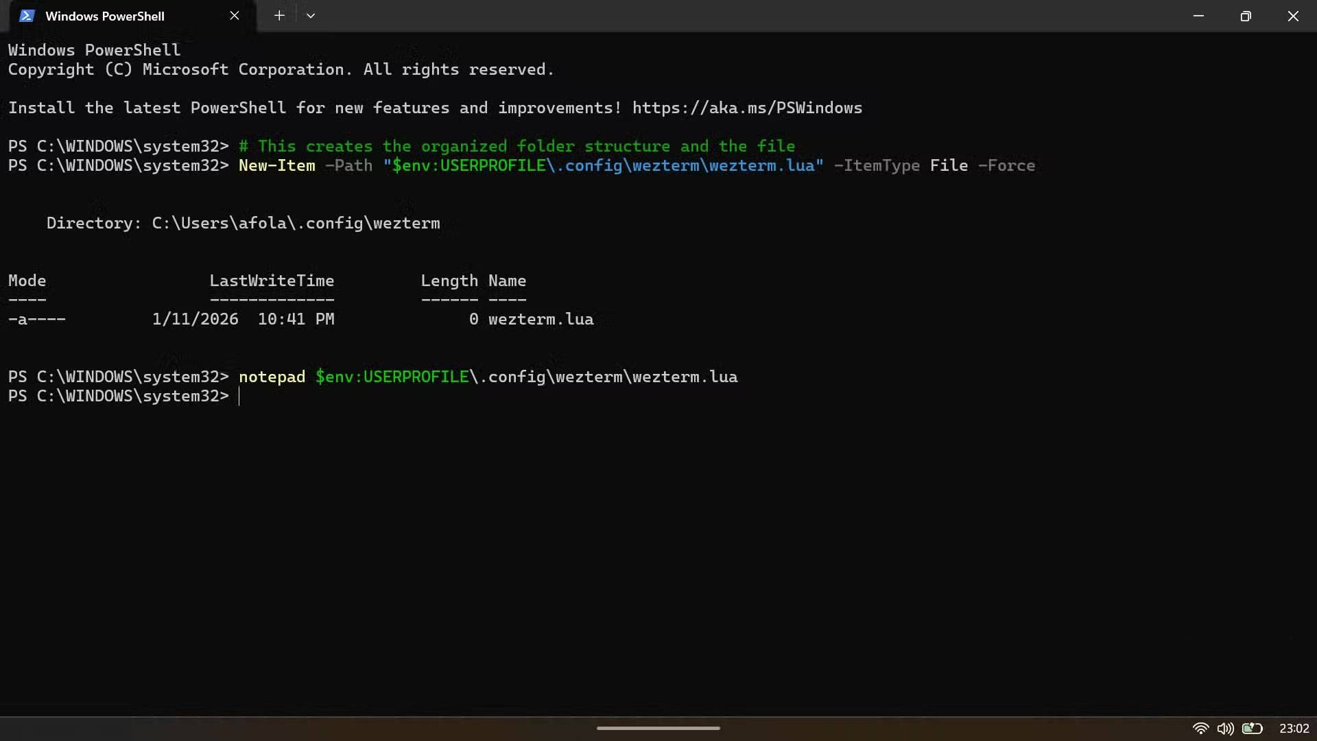 New-Item -Path "$env:USERPROFILE\.config\wezterm\wezterm.lua" -ItemType File -ForceSau khi file tin tồn tại, bạn có thể mở nó bằng bất kỳ trình soạn thảo nào mình thích: Notepad, VS Code hoặc thậm chí là trình soạn thảo terminal. Và bạn không cần phải tìm kiếm trong File Explorer mỗi khi muốn chỉnh sửa gì đó. Sau khi cấu hình được tạo, WezTerm về cơ bản có thể tự động mở cài đặt của nó cho bạn: