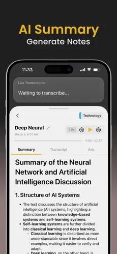 Được hỗ trợ bởi các mô hình AI Deep Neural Network hiện đại, ứng dụng này cung cấp bản ghi chính xác cao, chuyển đổi nội dung nói thành văn bản rõ ràng, có cấu trúc.