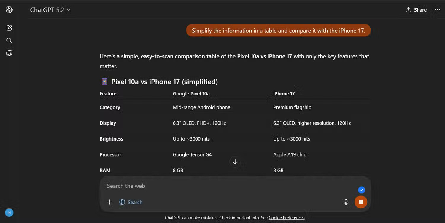 Khi tôi cần so sánh hai điện thoại, công cụ phần mềm hoặc framework, ChatGPT cung cấp một bản phân tích được trình bày tốt, có hoặc không cần gợi ý. Thường là dưới dạng bảng hoặc danh sách gạch đầu dòng, tổng hợp các thông số kỹ thuật và sự đánh đổi vào một giao diện (và gợi ý kết luận). Bạn có thể nghiên cứu sâu hơn hơn với tùy chọn Deep Research của ChatGPT.