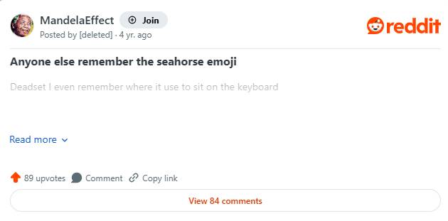 Nhưng emoji cá ngựa thực sự tồn tại - không phải trên bàn phím của bạn, mà là trong tâm trí mọi người. Hàng tá chủ đề trên Reddit tràn ngập những người khẳng định họ nhớ đến nó. Thành thật mà nói, nếu không tìm hiểu và có ai đó hỏi liệu emoji cá ngựa có tồn tại hay không, có lẽ bạn cũng sẽ trả lời là có. Mọi người đã nỗ lực hết sức để bảo vệ ký ức này. Trong một chủ đề, một người dùng thậm chí còn chỉ ra chính xác vị trí trên bàn phím, khẳng định nó hướng sang trái và mô tả màu sắc của nó.