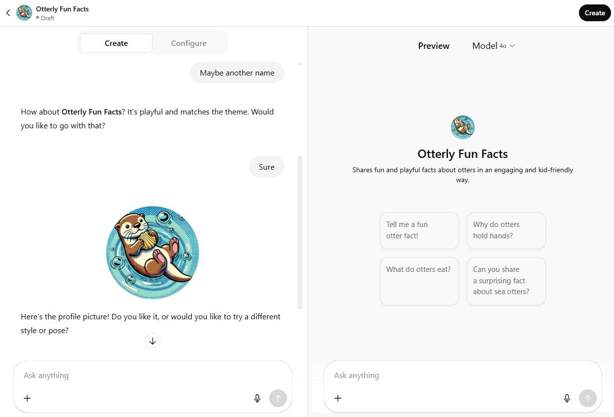 Đây là một ví dụ về GPT đã tạo bằng cách đơn giản yêu cầu trình tạo GPT tạo một chatbot chỉ chia sẻ những sự thật thú vị về loài rái cá.