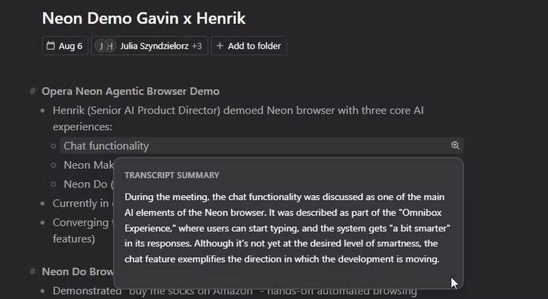 Ví dụ, trong một cuộc trò chuyện mà tác giả bài viết đã có với Opera về trình duyệt Neon AI sắp ra mắt, tác giả không nhớ rõ một số chi tiết, nhưng chúng không có trong ghi chú. Nhưng một lời nhắc nhanh chóng đã dễ dàng tìm thấy những gì cần biết. Từ đó, tác giả cũng có thể hỏi thêm về những chi tiết có thể đã bỏ lỡ trong cuộc trò chuyện, những vấn đề khác cần xem xét, v.v...