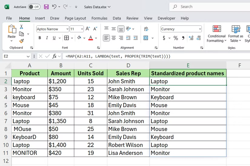 =MAP(A2:A11, LAMBDA(text, PROPER(TRIM(text))))Công thức này cắt bỏ các khoảng trắng không cần thiết và chuyển đổi từng tên sản phẩm sang dạng chữ hoa. Hàm TRIM loại bỏ các khoảng trắng đầu và cuối, trong khi hàm PROPER viết hoa chữ cái đầu tiên của mỗi từ. Hàm MAP áp dụng đồng thời cả hai hàm cho mọi ô trong phạm vi.