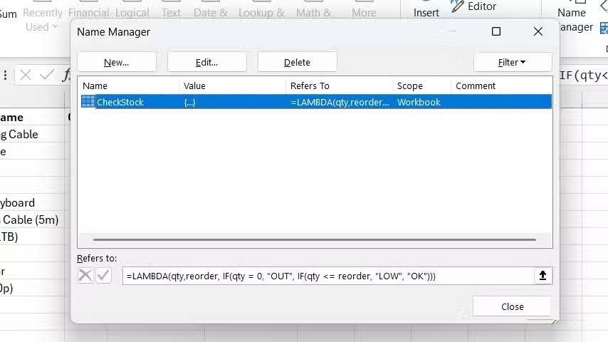Tiếp tục với ví dụ về tồn kho so với điểm đặt hàng lại, chúng ta có thể tạo một hàm LAMBDA được đặt tên là CheckStock bằng cách sử dụng Name Manager của Excel. Để làm điều này, hãy chọn tab Formulas và nhấp vào Define Name. Sau đó nhập CheckStock vào trường Name và nhập công thức bên dưới vào trường Refers to.