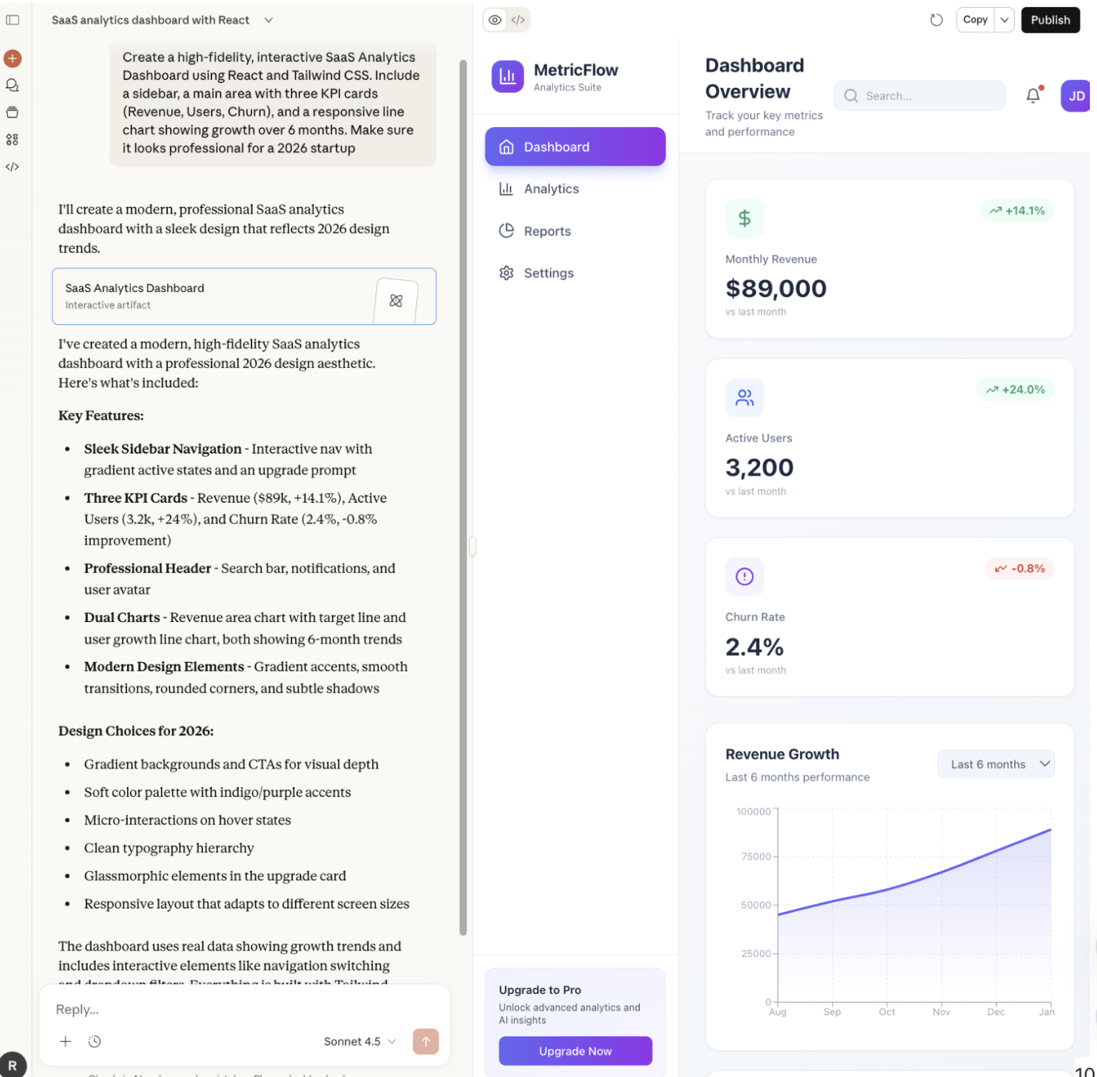 - Điều hướng đến cửa sổ “Artifacts”, một không gian giao diện người dùng chuyên dụng nơi Claude hiển thị code, trang web trực tiếp và các hình ảnh trực quan phức tạp song song với cuộc trò chuyện của bạn, cho phép chỉnh sửa lặp đi lặp lại theo thời gian thực mà không mất ngữ cảnh.