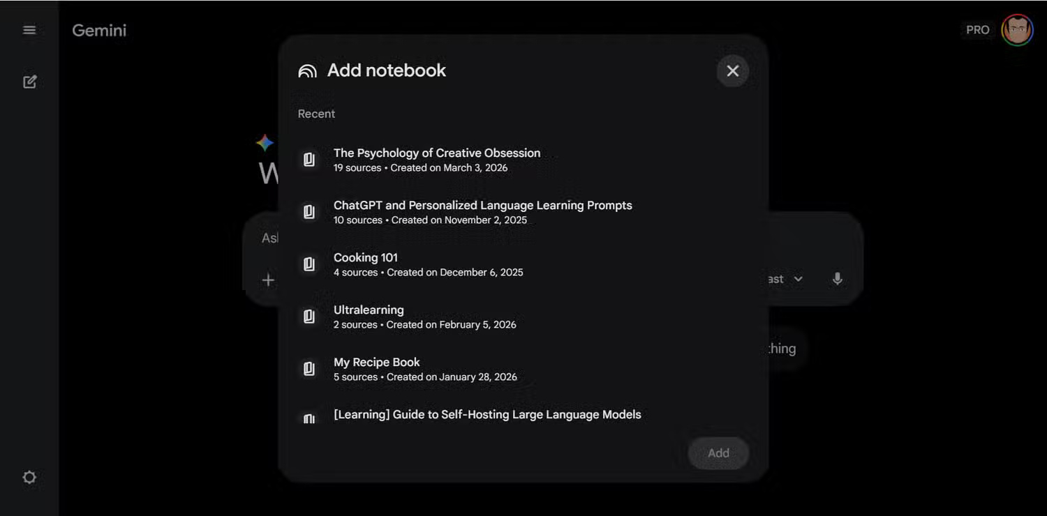 Một trong những điểm gây khó chịu lớn nhất của NotebookLM là tính cô lập của nó. Mỗi notebook giống như một container riêng biệt, giúp mọi thứ được sắp xếp gọn gàng nhưng lại gây khó khăn cho việc tư duy liên ngành. Bên trong Gemini, bạn có thể kết nối nhiều notebook cùng lúc và đặt các câu hỏi bao quát tất cả chúng, điều mà bản thân NotebookLM cho đến nay vẫn chưa thể thực hiện được một cách tự nhiên.