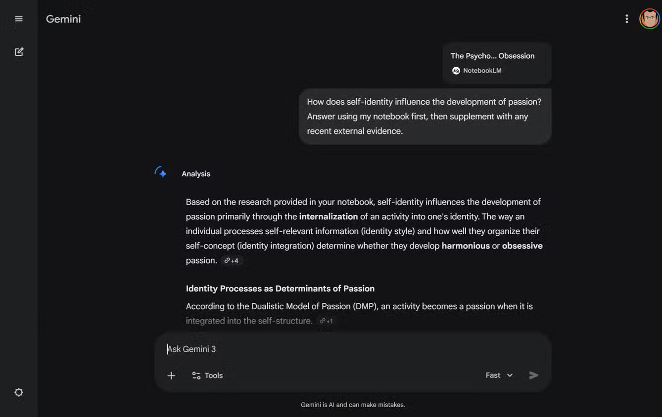 NotebookLM rất giỏi trong việc tìm kiếm câu trả lời trong các tài liệu bạn chọn và upload lên. Điều này giúp loại bỏ ảo giác. Nhưng ngay khi bạn hỏi điều gì đó không được đề cập trong nguồn, nó sẽ đơn giản nói rằng nó không biết. Việc đính kèm notebook của bạn vào Gemini sẽ phá vỡ rào cản đó. Bạn có thể thiết lập để Gemini ưu tiên sử dụng các nguồn đã upload lên, sau đó mới tìm kiếm trên web khi thông tin ban đầu cạn kiệt.