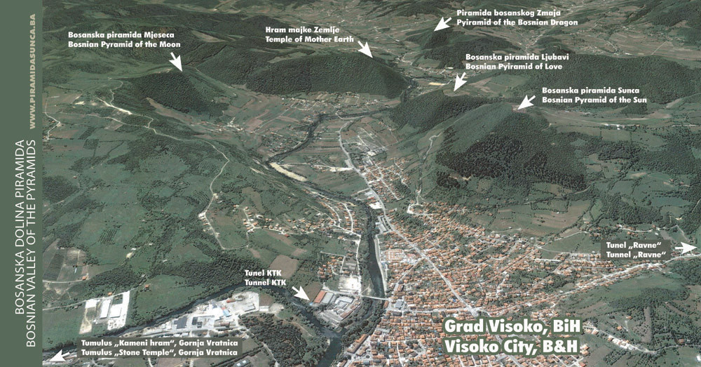 "Thung lũng của các kim tự tháp" này nằm ở thành phố Visoko thuộc Bosnia với những kim tự tháp khổng lồ: kim tự tháp Mặt Trời cao hơn 220m, kim tự tháp Mặt Trăng cao 190m, kim tự tháp Rồng cao 90m, kim tự tháp thờ Mẹ Trái Đất và kim tự tháp Tình yêu. Kim tự tháp Mặt Trời, kim tự tháp Mặt Trăng và kim tự tháp Rồng đều hình tam giác cân. Tất cả kim tự tháp đều xây hướng về phía bắc.