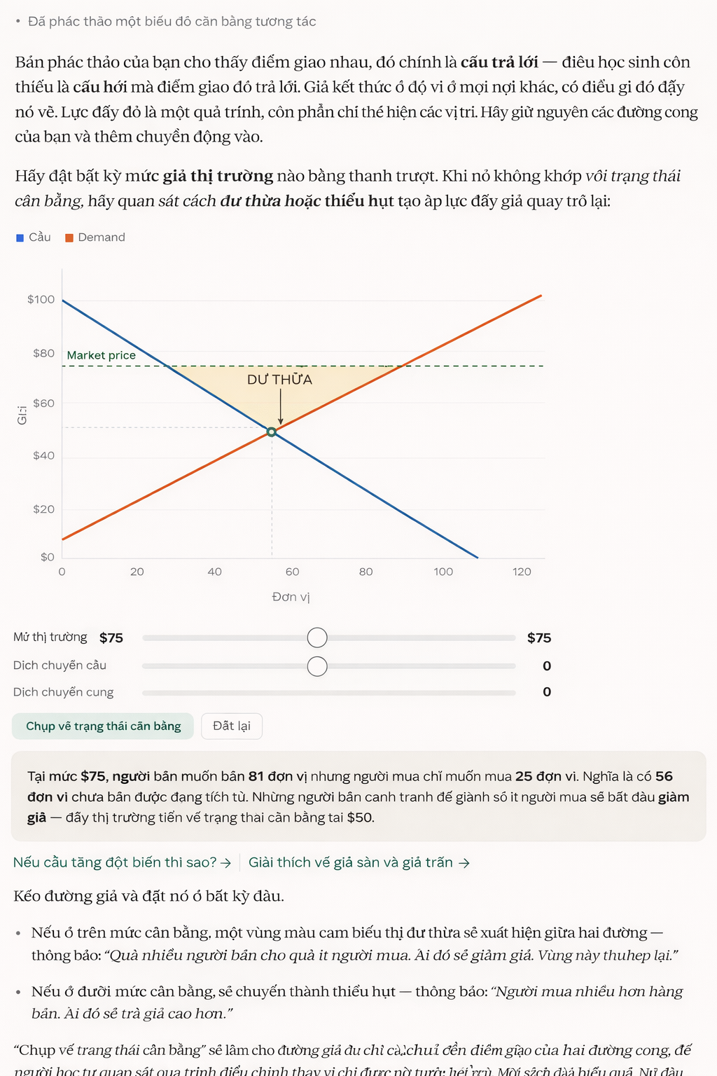 Ở đây, một giáo sư đang lên kế hoạch cho bài giảng về cân bằng cung cầu vào tuần tới. Giáo sư đính kèm sơ đồ đã sử dụng và yêu cầu Claude giúp suy nghĩ xem tại sao sinh viên lại gặp khó khăn ở phần này. Câu trả lời vừa là lời khuyên giảng dạy, vừa là biểu đồ tương tác - và biểu đồ tiếp tục phát triển khi cuộc trò chuyện diễn ra.