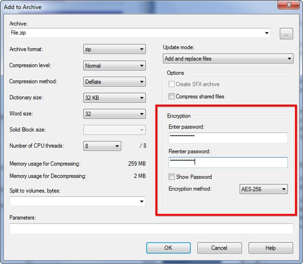 Sau khi tải về và cài đặt, bạn có thể tạo các tập tin nén ngay trong giao diện phần mềm hay từ lệnh trong menu chuột phải của Windows Explorer với thiết lập mật khẩu để mã hóa. Và kiểu mã hóa bạn nên chọn ở đây là chuẩn AES-256. Như vậy, bất cứ ai muốn giải nén đều phải tiến hành nhập mật khẩu để mở khóa tập tin và sử dụng.