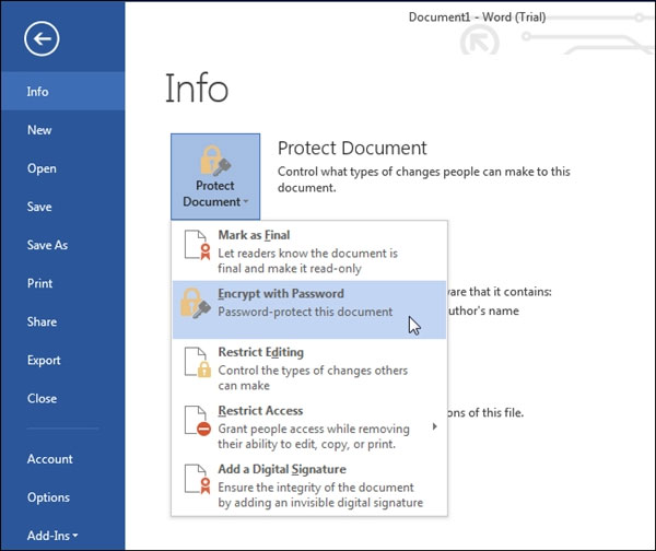 Bạn có thể tiến hành mã hóa và đặt mật khẩu cho tài liệu văn bản trong Office 2010 và Office 2013 bằng cách mở tài liệu lên và nhấn vào "FILE > Protect Document > Encrypt With Password". Tiếp theo là việc nhập mật khẩu cần thiết lập cho tập tin.
