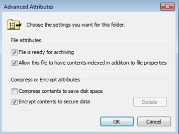 - Encrypting File System (EFS): Cho phép người dùng mã khóa tập tin cá nhân. Bạn có thể sử dụng tính năng này bằng cách nhấn phải chuột vào tập tin và chọn "Properties > nhấn chọn Advanced trong tab General". Một cửa sổ hiện lên, đánh dấu vào tùy chọn "Encrypt contents to secure data".
