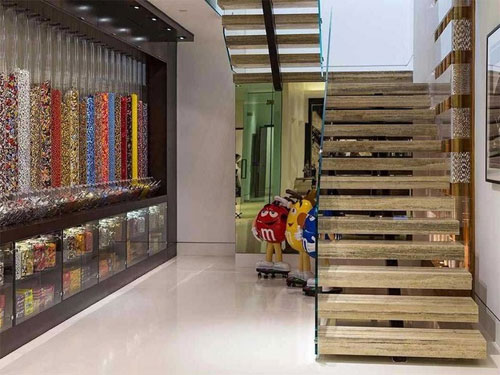 Nằm bên cạnh phòng tập trong căn biệt thự, Markus cho xây một bức tường vô cùng đặc biệt, dùng để đựng rất nhiều kẹo cùng với những bức tượng nhân vật M & M.