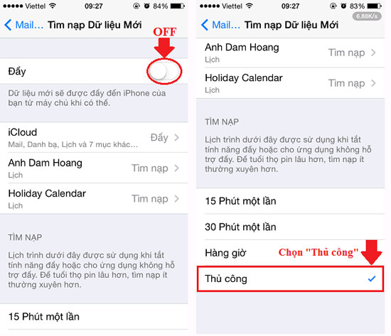 Cách khắc phục: Chọn Cài đặt > Mail, Danh bạ và Lịch > Tìm nạp Dữ liệu Mới. Tiếp theo, chuyển thanh trượt của "Đẩy" về trạng thái OFF. Tiếp tục kéo xuống dưới mục "Tìm nạp" và chọn "Thủ công". Sau khi hoàn tất các bước trên, email mới giờ đây sẽ chỉ xuất hiện khi bạn mở ứng dụng hộp thư.