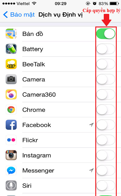 Cách khắc phục: Vào Cài đặt > Bảo mật > Dịch vụ Định vị. Tiếp đó, lăn thanh trượt sang trạng thái OFF để vô hiệu hóa tính năng với những ứng dụng không cần thiết phải sử dụng dịch vụ GPS.