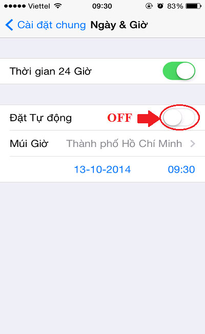 Cách khắc phục: Vào Cài đặt > Cài đặt chung > Ngày & Giờ. Tiếp theo, vô hiệu hóa tính năng "Đặt Tự động". Chú ý, bạn cũng có thể thực hiện các bước tương tự để kích hoạt lại tính năng này khi đi du lịch hoặc công tác nước ngoài.