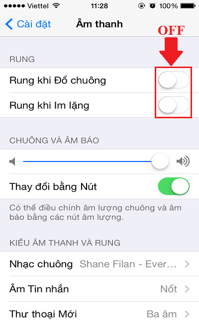Cách khắc phục: Vô hiệu hóa tính năng rung bằng cách truy cập vào Cài đặt > Âm thanh và chuyển sang trạng thái OFF cho cả 2 chế độ "Rung khi Đổ chuông" và "Rung khi Im lặng".