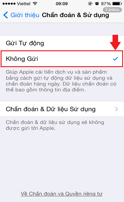 Cách khắc phục: Truy nhập vào Cài đặt > Cài đặt chung > Giới thiệu > Chuẩn đoán & Sử dụng và tích vào "Không Gửi" để vô hiệu hóa tính năng tự động gửi phản hồi cho Apple.