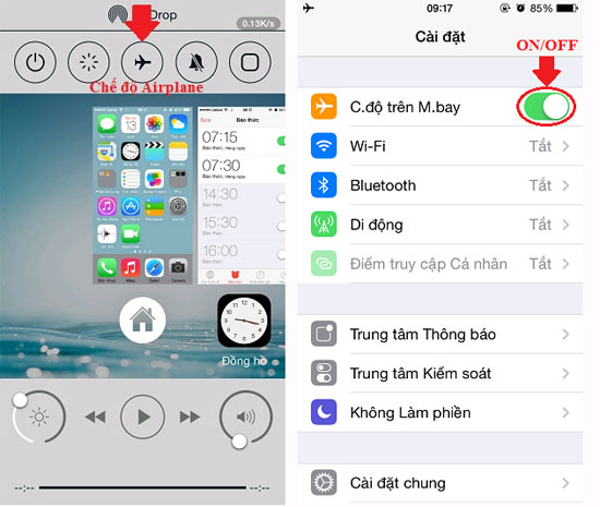Cách khắc phục: Mỗi khi bạn đi vào vùng không có sóng/sóng yếu, hãy bật chế độ Airplaine bằng thao tác vuốt màn hình từ dưới lên và chọn biểu tượng máy bay, hoặc truy cập vào Cài đặt > Chế độ trên máy bay và trượt con lăn sang chế độ On.