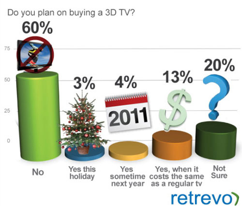 60% khách hàng, theo đánh giá của Retrevo, cảm thấy không hứng thú với TV 3D, và chỉ có 3% có ý định mua TV 3D trong dịp cuối năm sắp tới.