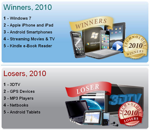 Thậm chí trong bản báo cáo tổng kết về tình hình công nghệ điện tử tiêu dùng 2010, Retrevo còn lựa chọn TV 3D là một trong 5 công nghệ thất bại của năm 2010, cùng với thiết bị GPS, máy nghe nhạc MP3 hay netbook. Trong khi đó, TV và nội dung phim trực tuyến, sách điện tử Kindle, điện thoại Android, iPhone lại được đánh giá là những công nghệ thành công trong năm 2010.