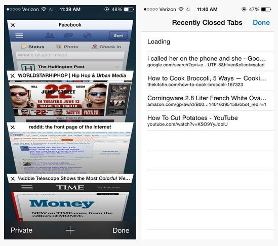 Trong lúc thao tác bạn lỡ tay đóng 1 tab trên Safari, điều đó có thể xẩy ra với bất kỳ ai. Với Safari iOS 8, rất đơn giản để bạn mở lại được tab vừa lỡ đóng, nhấp và giữ biểu tượng dấu cộng “+” sẽ hiện ra danh sách những tab bạn vừa đóng: