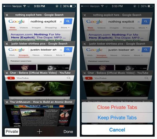 Trong iOS 7, lựa chọn duyệt web ẩn danh (Private) nếu được thiết lập sẽ áp dụng cho tất cả các tabs trong trình duyệt chứ không mở ra một cửa sổ mới riêng biệt như trong iOS 8.