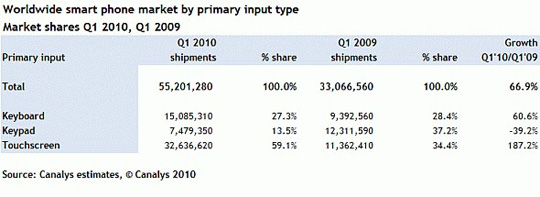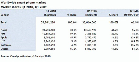 Hãng nghiên cứu công nghệ cao Canalys vừa công bố báo cáo về thị trường smartphone trong quý I/2010. So với năm ngoái, điện thoại thông minh bán ra tăng tới 67%, với 55 triệu model xuất xưởng.