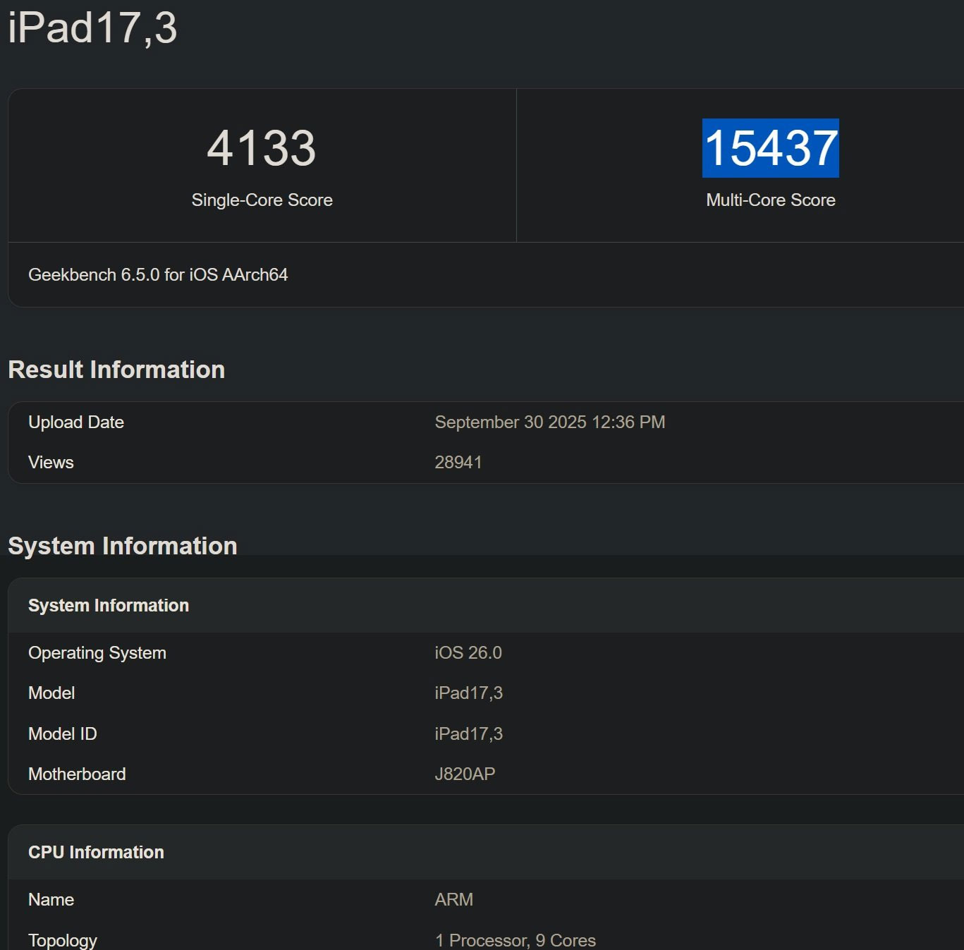 Cụ thể, theo dữ liệu xuất hiện trên Geekbench, một mẫu iPad chưa ra mắt được cho là sử dụng chip M5 vừa đạt điểm số ấn tượng: 4.133 điểm đơn nhân và 15.437 điểm đa nhân . Bộ vi xử lý này, nhiều khả năng là một biến thể của M5, có xung nhịp đạt 4,42GHz , đi kèm 12GB RAM cùng tùy chọn bộ nhớ 256GB hoặc 512GB.