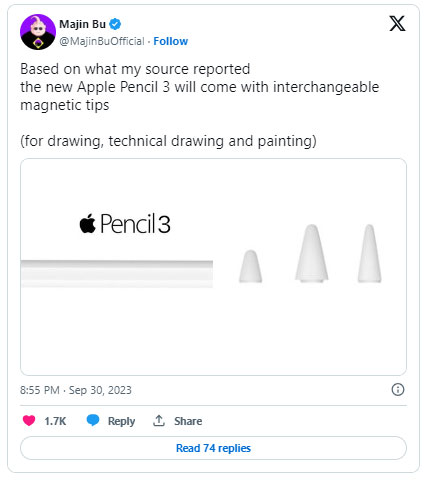 Một điều khác có thể xuất hiện là khả năng thay đổi ngòi bút bằng các lựa chọn thay thế phù hợp hơn cho những nhiệm vụ cụ thể. Ví dụ, một đầu bút dày hơn có thể hữu ích khi tạo một bức tranh kỹ thuật số, trong khi một đầu bút dài và mỏng có thể giúp tạo ra những nét vẽ đẹp như bút chì. Người dùng X Majin Bu dự đoán việc thay ngòi sẽ hoạt động thông qua các tip từ tính. Apple Pencil hiện tại cũng có thể thay ngòi bút nhưng phải tháo hẳn ra và không có sẵn các kiểu dáng ngòi khác nhau.