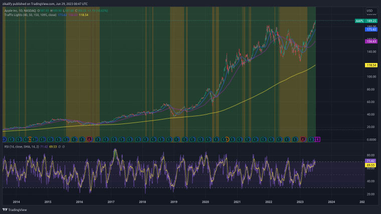 Chỉ số Relative Strength Index (RSI) hiện cho thấy Apple đang nằm trên đường trung bình động RSI, đồng nghĩa với việc thị trường có thể tiếp tục chứng kiến một số động lực tăng trưởng cao hơn trong giá trị cổ phiếu của công ty sở hữu thương hiệu iPhone, điều này có thể sớm đưa họ đến với mức vốn hóa thị trường 3 nghìn tỷ đô la. Tuy nhiên, chỉ số RSI ở mức 71,42 và bất kỳ giá trị nào trên 70 như của Apple hiện tại đều cho thấy một tài sản bị mua quá mức và sắp có một đợt giảm giá, vì vậy kết quả thực tế có thể diễn biến theo cả hai chiều hướng.