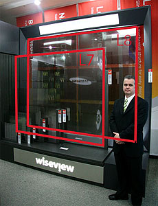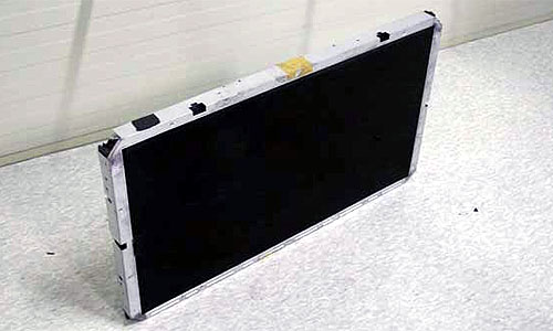 Còn đây là một màn hình hoàn chỉnh đang đợi được đóng khung. Theo nhà sản xuất, màn hình được phân chia làm 3 cấp độ chất lượng khác nhau, trong đó cấp độ A cao nhất sẽ là sản phẩm đến tay khách hàng. Trong tỷ lệ lỗi khoảng 1/100, số màn hình lỗi sẽ được xếp hạng B hoặc C. Ở mức chất lượng A hoặc B mà có một vài lỗi, màn hình sẽ được tái sử dụng làm màn hiển thị thông tin bên trong nhà máy hoặc bán rẻ cho nhân viên. Còn lỗi cấp độ C màn hình sẽ được tháo ra để tái sử dụng các thiết bị vẫn còn dùng được. Nhưng nếu lỗi cấp độ C mà vấn đề bắt nguồn từ bản thân tấm nền, màn hình này sẽ bị đem đi tiêu hủy.