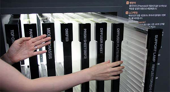 Như trong ảnh, có ít nhất 8 lớp trên một màn hình. Đầu tiên là lớp khung kim loại phía trên cùng với tấm nền được gắn vào giữa. Sau đó là lớp phim tăng sáng (Dual Brightness Enhancement Film _DBEF) được thiết kế nhằm cung cấp ánh sáng cho góc nhìn rộng hơn. Sau đó là các tấm lăng kính, tản sáng để điều hướng ánh sáng từ lớp đèn nền cuối cùng phát ra.