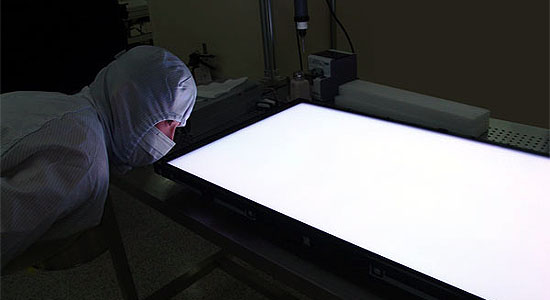 Tuy nhiên, không giống như trong ảnh của Samsung cung cấp (phía trên), các kỹ thuật viên kiểm tra màn hình ngồi vuông góc ở phía trên băng chuyền, dõi mắt trên từng phần của tấm nền để xem có phần nào bị lỗi đèn nền hay điểm chết hay không. Tấm nền lần lượt hiển thị ánh sáng trắng, rồi lục, đỏ và lam trong suốt tiến trình kiểm tra. Mặc dù tấm nền có đèn nền riêng nhưng nó vẫn chưa có thiết bị xử lý hình ảnh, vì thế việc kiểm tra hiển thị sẽ được thực hiện thông qua việc hiện các bảng màu thử.