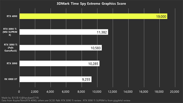 Tuy nhiên, mức tiêu thụ điện năng lớn chắc chắn sẽ phải đi kèm với hiệu năng mạnh mẽ hơn, và có vẻ như RTX 4090 có thể làm tốt điều đó. Theo kết quả đánh giá benchmark mới bị rò rỉ gần đây bởi leaker nổi tiếng kopite7kimi, RTX 4090 đã đạt hơn 19.000 điểm trong bài kiểm tra đồ họa Time Spy Extreme của 3DMark. Time Spy là bài kiểm tra DirectX12 của UL Benchmarks và thang đánh giá Extreme tiêu chuẩn, được dùng để kiểm tra GPU ở độ phân giải 4K. Bên cạnh RTX 4090, các sản phẩm tham chiếu khác bao gồm Nvidia RTX 3090 Ti AIB, RTX 3090 và AMD RX 6900 XT.