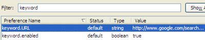 Để thiết lập, trên thanh địa chỉ của Firefox, gõ about:config rồi nhấn phím Enter. Trên dòng trắng trong bảng hiện ra, gõ chữ keyword rồi nhấn đúp vào mục keyword.URL ở bảng phía dưới để chèn xâu http://www.google.com/search?btnG=Google+Search&q= rồi nhấn OK.