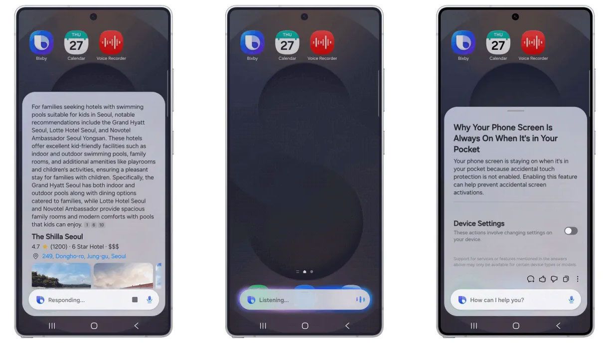 Trợ lý này cũng có khả năng nhận biết trạng thái thiết bị để hỗ trợ xử lý sự cố. Chẳng hạn, nếu người dùng thắc mắc vì sao điện thoại thường sáng màn hình khi để trong túi quần, Bixby có thể gợi ý bật tính năng “Accidental Touch Protection”.
