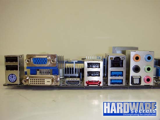 Trong hình 5 bạn có thể thấy panel phía sau của bo mạch chủ: một cổng bàn phím PS/2, năm cổng USB 2.0 (bốn màu đen và một màu xanh), một cổng VGA, một cổng DVI-D, một cổng HDMI, một cổng eSATA-300, một cổng Gigabit Ethernet, một cổng USB 3.0 (một màu xanh bên dưới) và các đầu ra âm thanh 7.1 được dùng chung với các cổng “mic in” và “line in”.