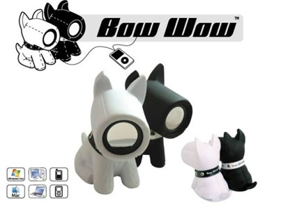 Những ai thích chó sẽ rất “khoái” bộ loa này. Bow Wow được thiết kế theo kiểu dáng của những chú cún con, trông rất dễ thương. Chất liệu loa làm bằng da ở dạng màu trắng và đen. Loa Bow Wow có thể kết nối với máy nghe nhạc MP3, laptop, máy chơi game, điện thoại di động và nhiều thiết bị khác.