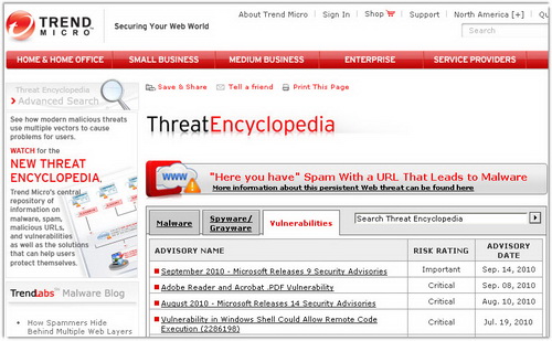 Mục Threat Encyclopedia được xem như sách giáo khoa về virus, spyware, chúng được sắp xếp theo thứ tự của bản chữ cái. Nhưng so với các dịch vụ trên, việc tìm kiếm đối tượng mong muốn không dễ dàng và nguồn thông tin tại đây cũng chưa nhiều, chưa cập nhật thường xuyên.