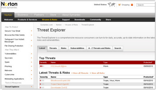 Norton Threat Explorer cung cấp danh sách đối tượng được phân loại theo các chủ đề Latest, Threats, Risks, Vulnerabilities, A-Z Threats & Risks. Nếu biết tên của một virus hay gián điệp thì bạn bấm vào thẻ Search rồi nhập từ khóa cần tìm vào ô Search for.