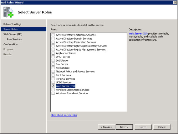 IIS 7.0 là một thành phần trong Windows Server 2008 Server Roles. IIS có thể được cài đặt thông qua GUI bằng cách sử dụng giao diện quản lý máy chủ Server Manager mới sau khi hệ điều hành Windows Server 2008 được cài đặt.