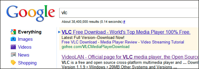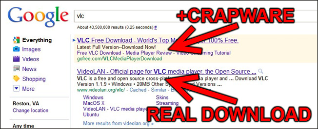 Nếu sử dụng Google hoặc Bing để tìm kiếm, thì kết quả hiển thị đầu tiên ở vị trí trên cùng, thực chất là 1 địa chỉ quảng cáo, và không phải là đường dẫn chính xác. Dưới đây là danh sách 1 số phần mềm có “vấn đề”, nhưng trên thực tế còn rất nhiều chương trình khác đang lâm vào tình trạng tương tự: