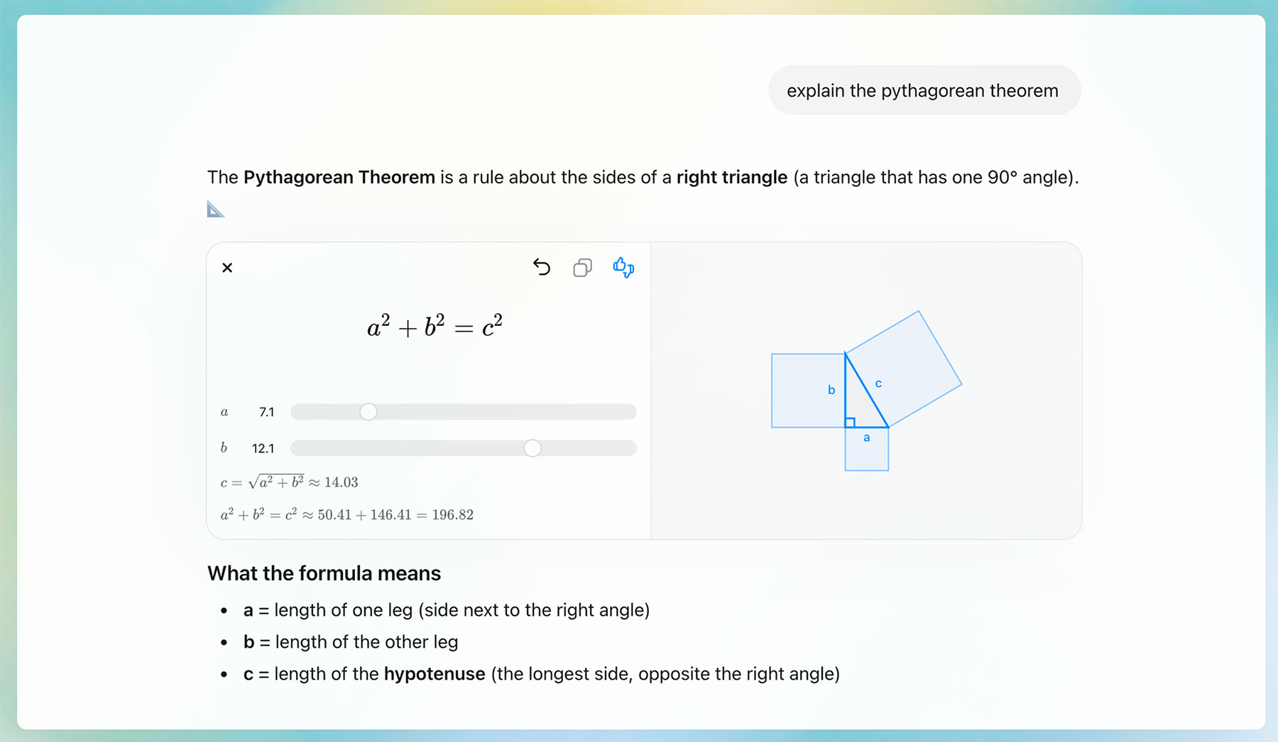 Thay vì chỉ đọc phần giải thích bằng văn bản hoặc nhìn vào một sơ đồ tĩnh, người dùng giờ đây có thể tương tác trực tiếp với các hình minh họa . Chẳng hạn, khi tìm hiểu về Pythagorean theorem , bạn có thể thay đổi độ dài các cạnh của tam giác và ngay lập tức thấy cạnh huyền được cập nhật theo công thức. Người dùng có thể điều chỉnh các con số hoặc biến số và quan sát sự thay đổi diễn ra ngay lập tức trên hình minh họa.