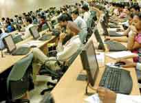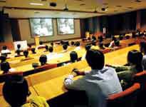 Trong phòng rèn luyện kỹ năng cơ bản của Trung tâm Giáo dục Toàn cầu | Các học viên mới đang theo dõi video chào mừng của chủ tịch kiêm giám đốc đào tạo Infosys - Narayana Murthy - trong Trung tâm Giáo dục toàn cầu |